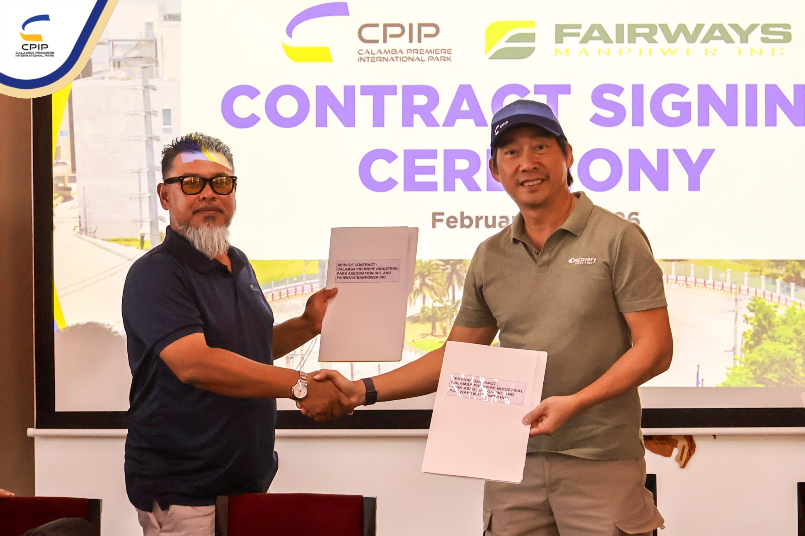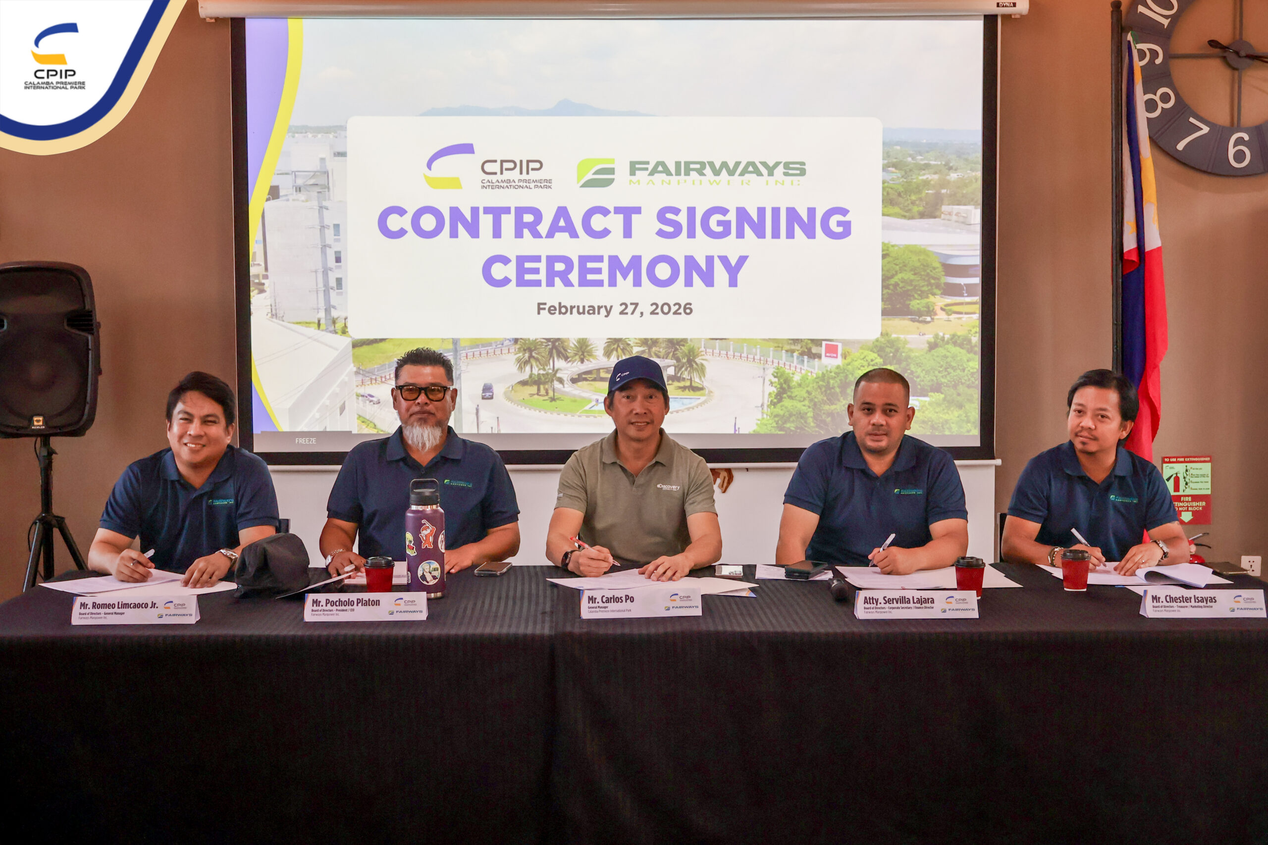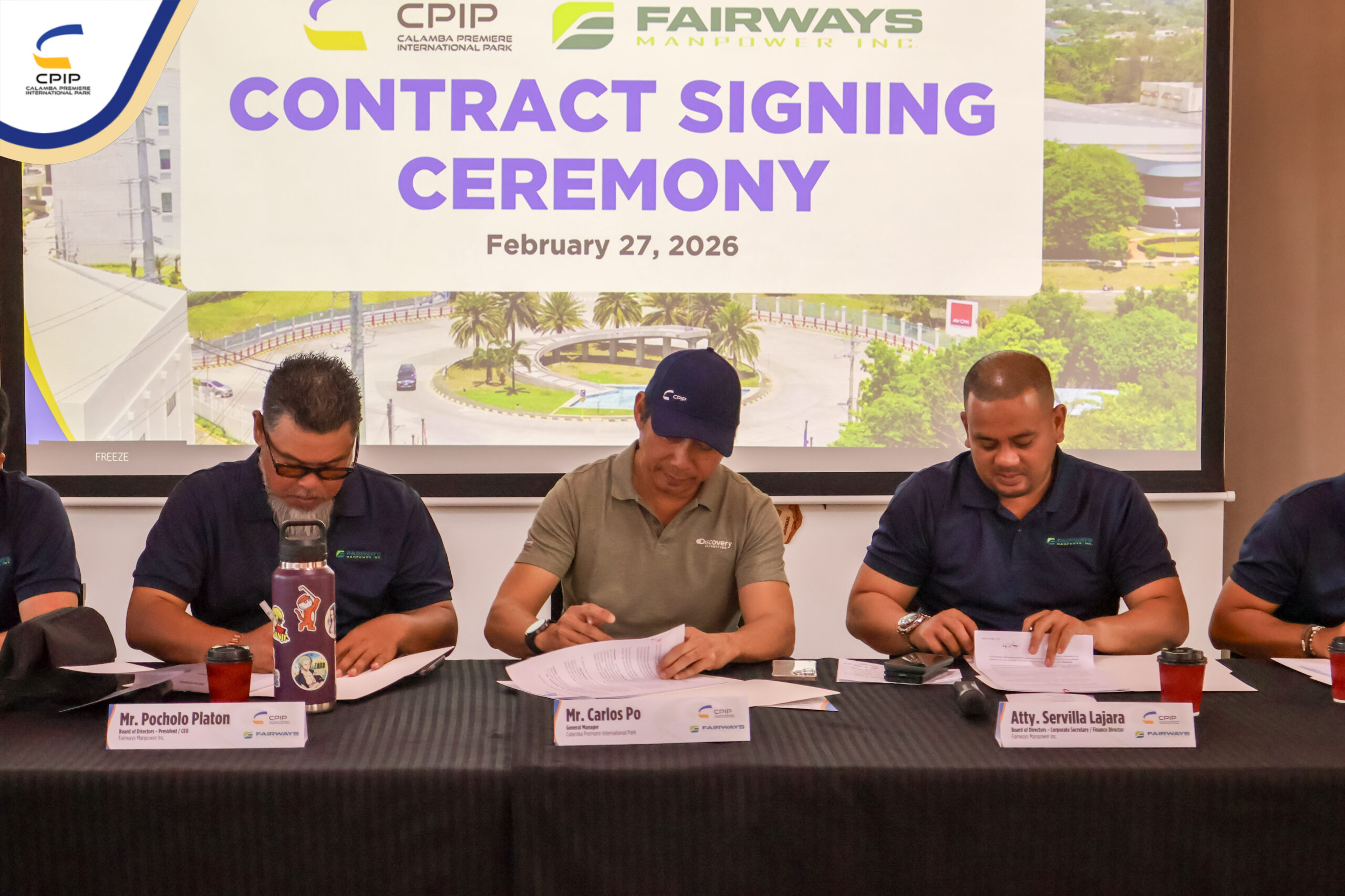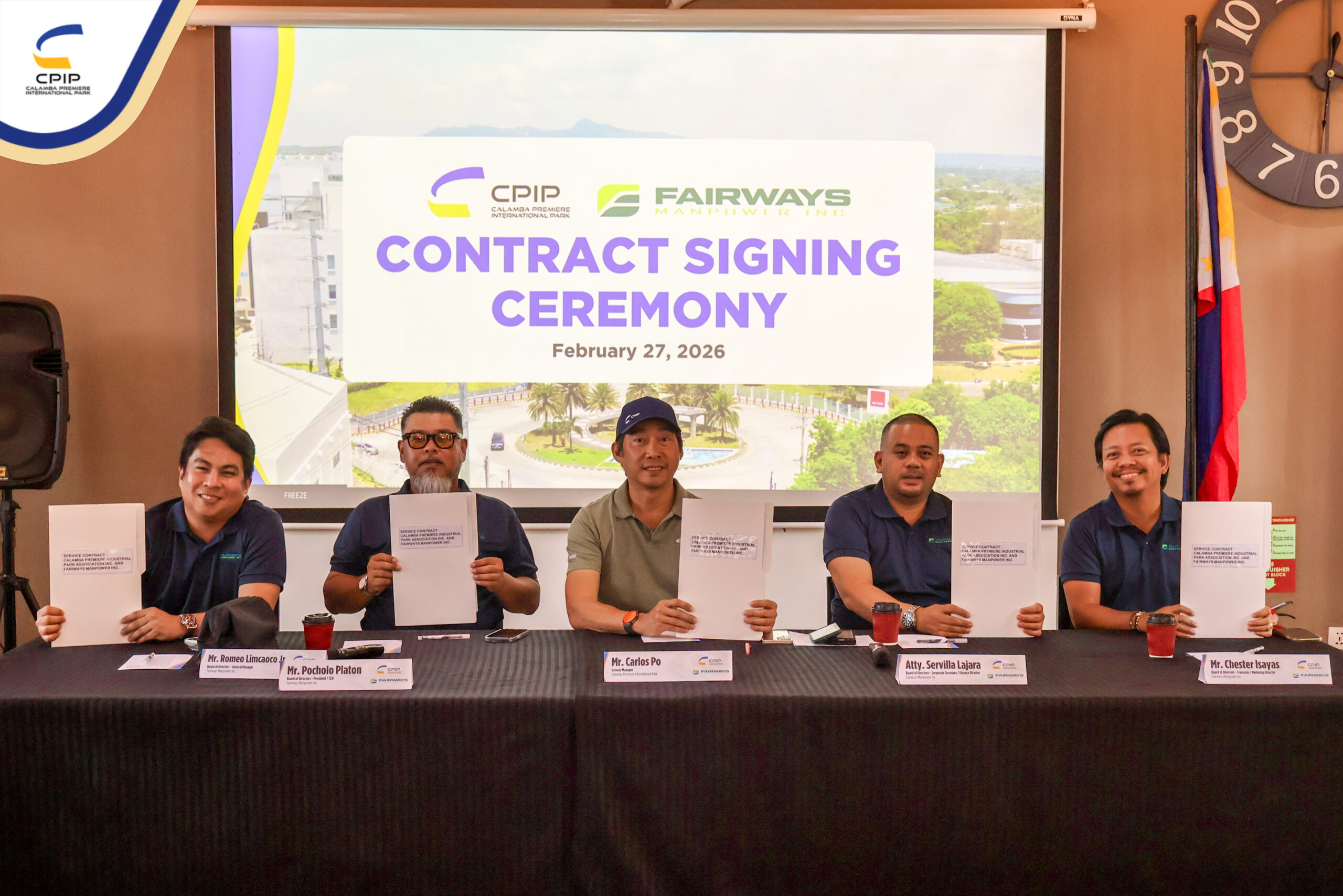 On February 27, 2026, Calamba Premiere International Park (CPIP) marked another step forward in strengthening its operational support services through the signing of a service contract with Fairways Manpower Inc., held in the presence of key representatives from both organizations.
