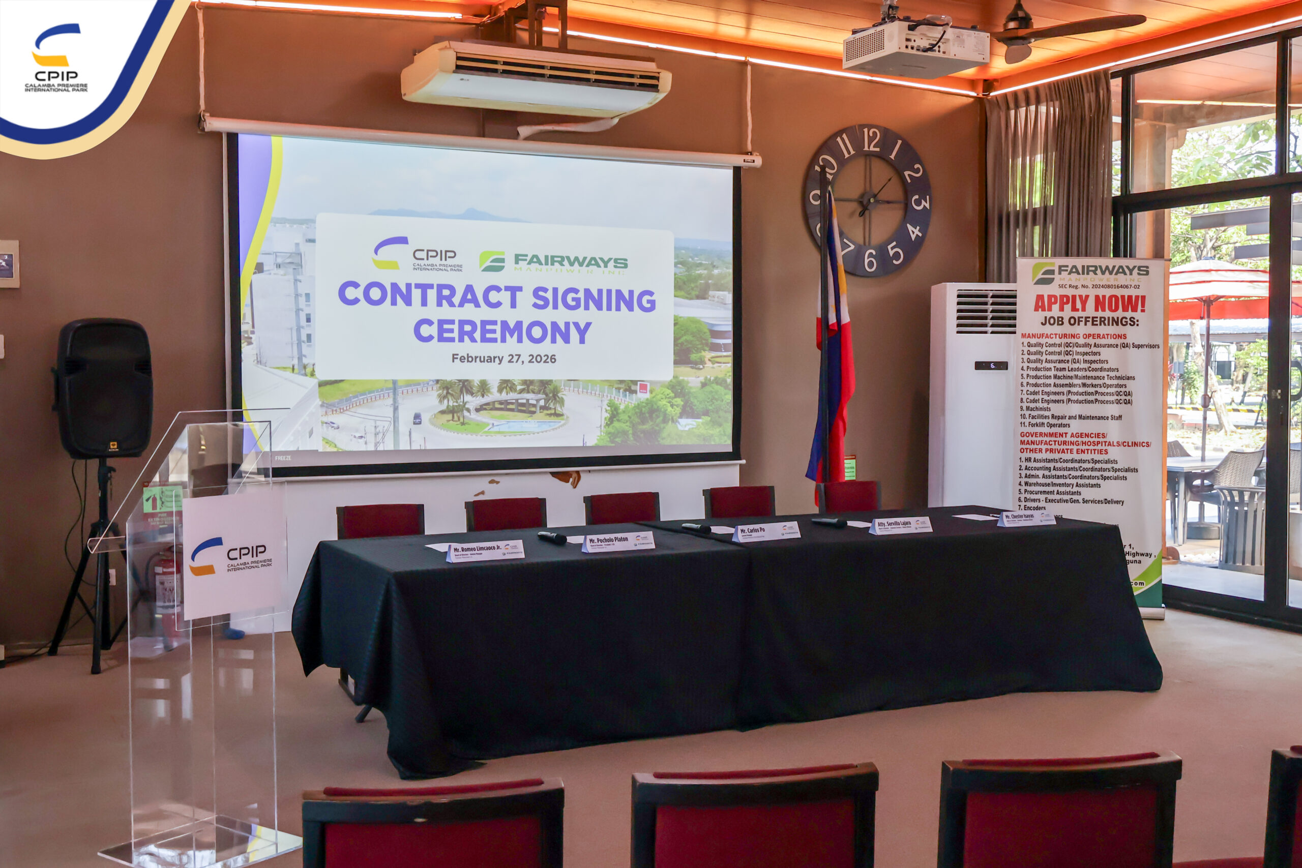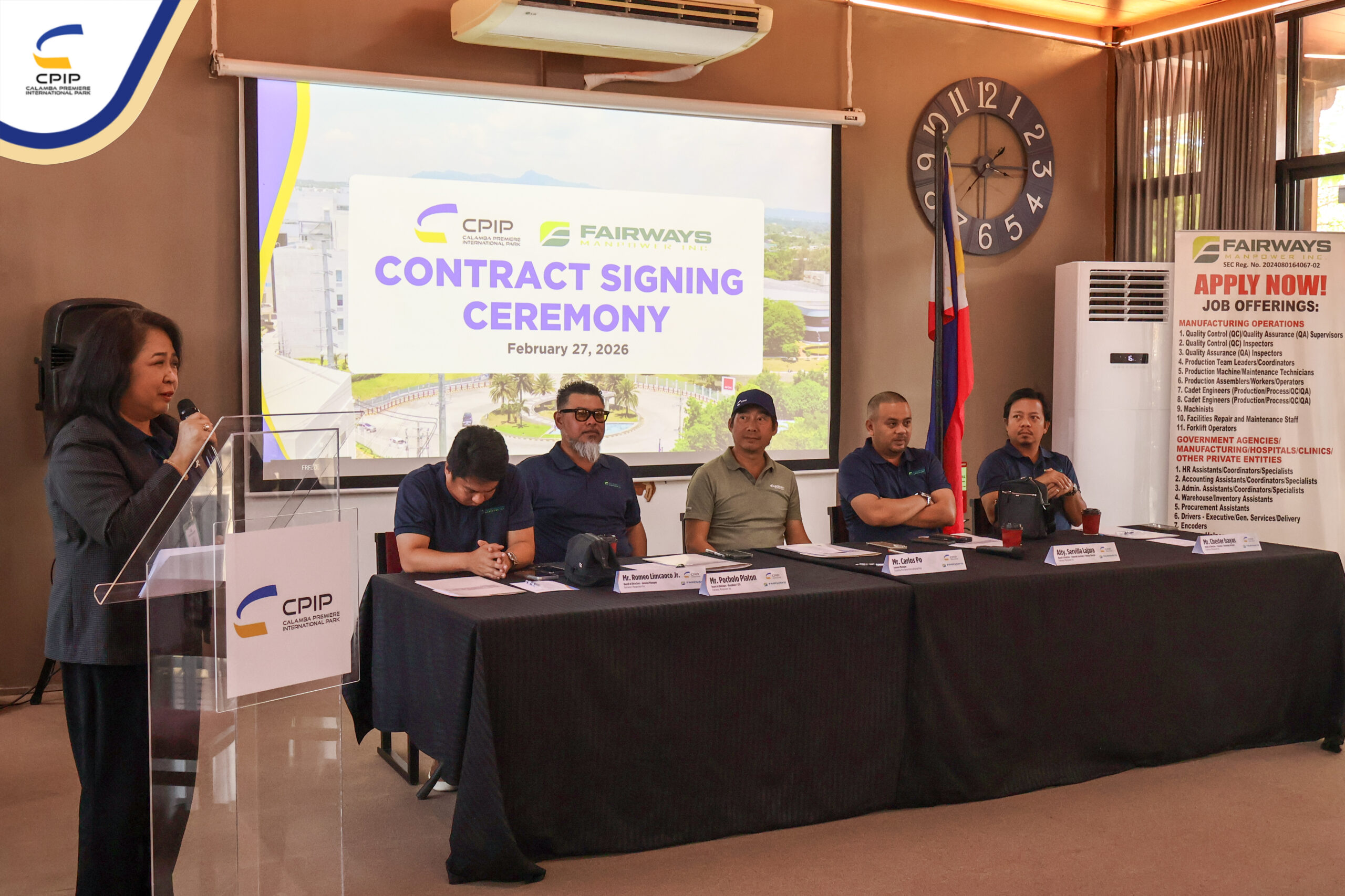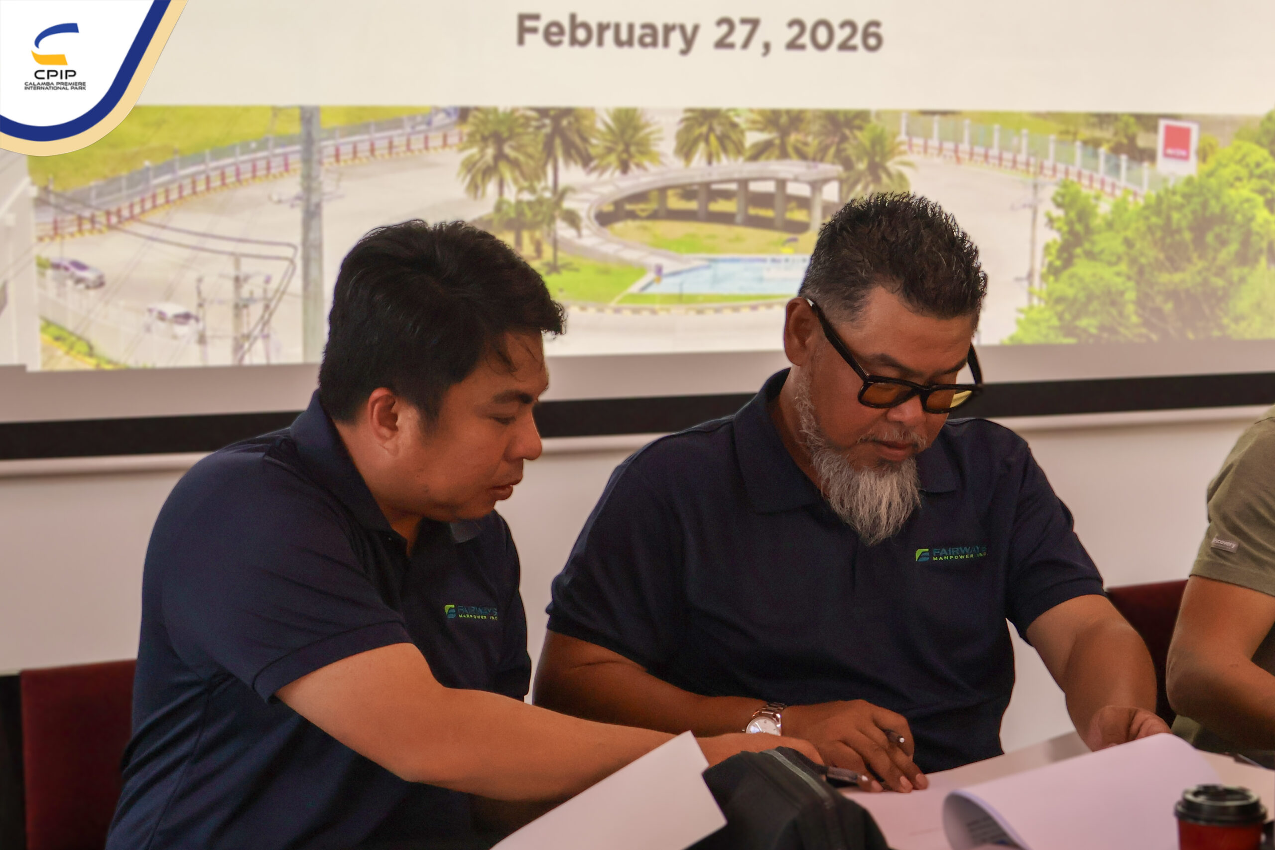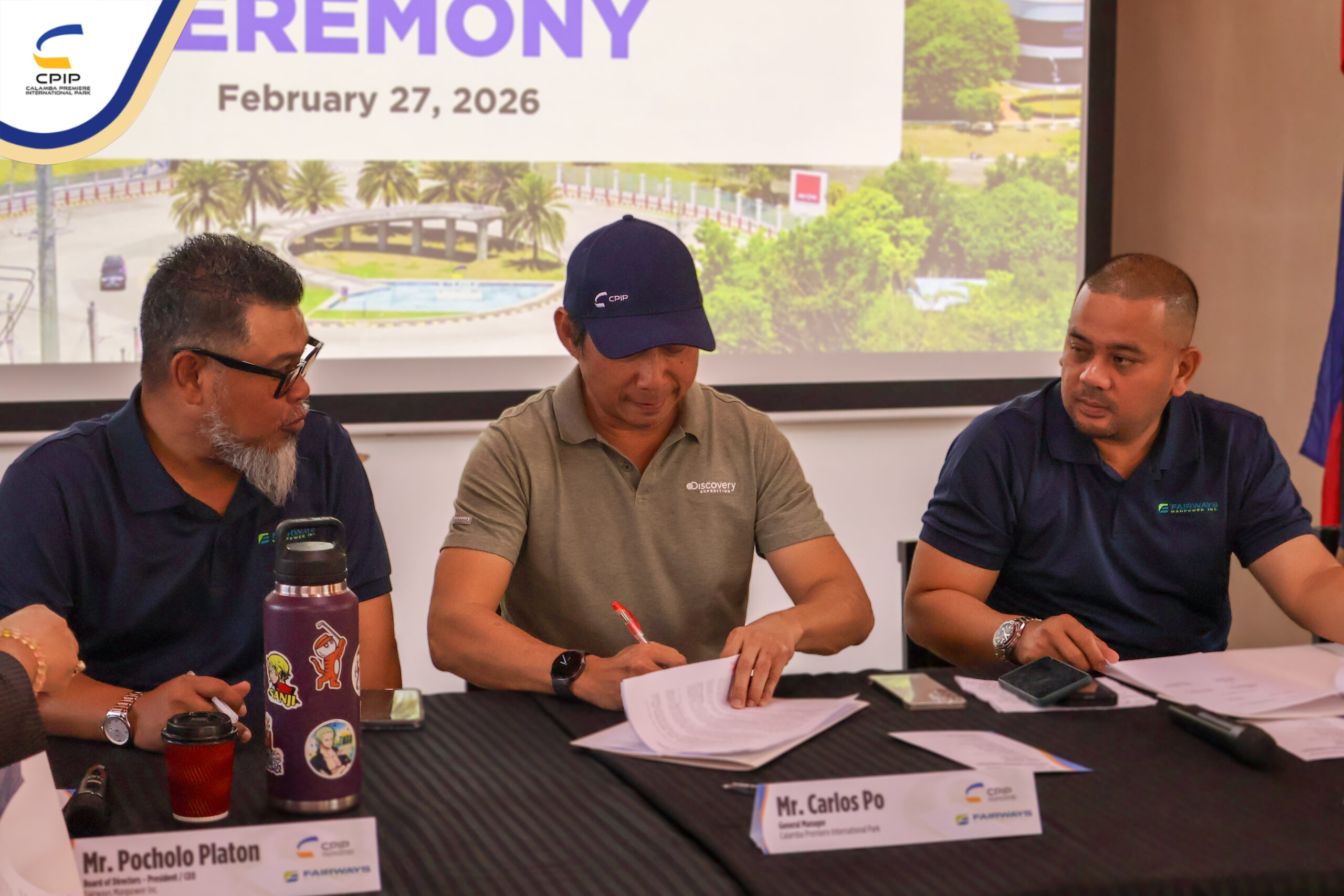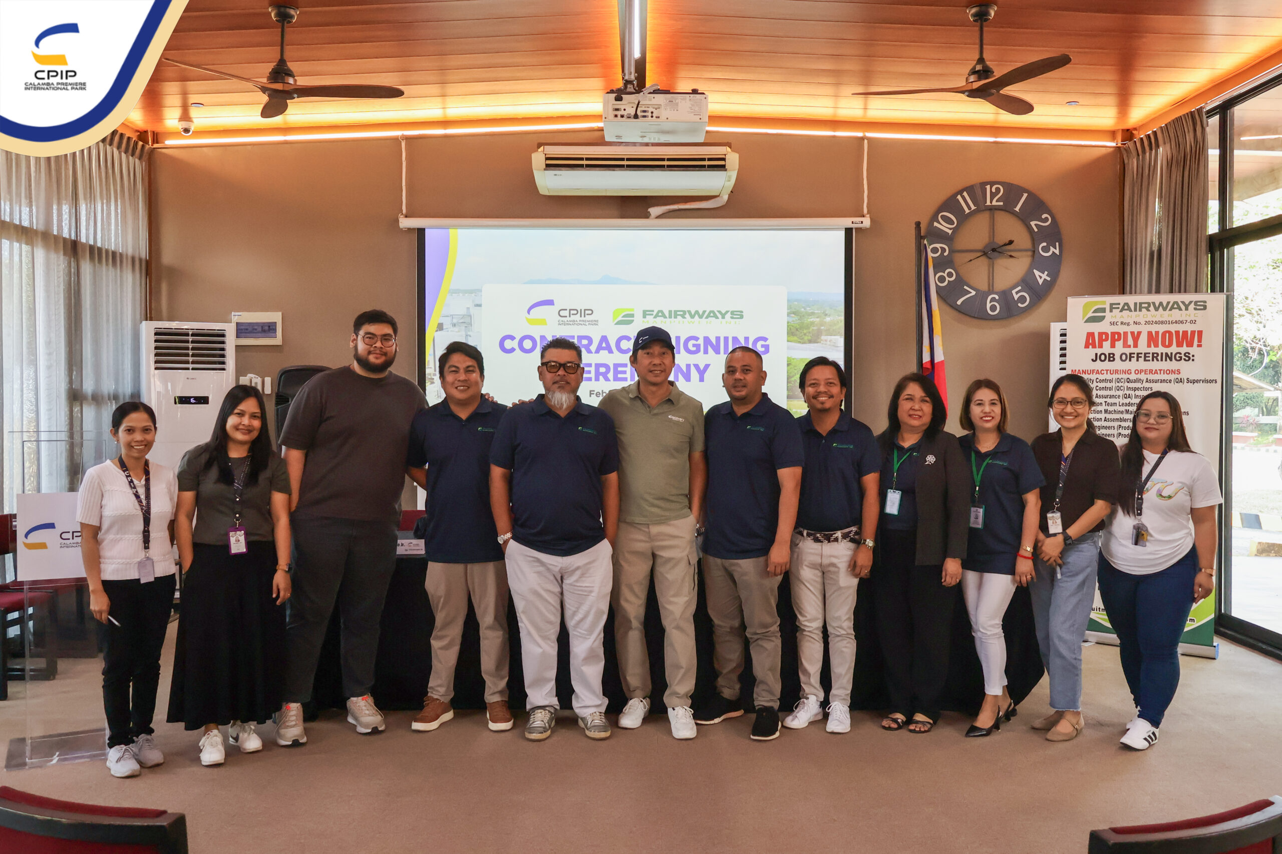 On February 27, 2026, Calamba Premiere International Park (CPIP) marked another step forward in strengthening its operational support services through the signing of a service contract with Fairways Manpower Inc., held in the presence of key representatives from both organizations.